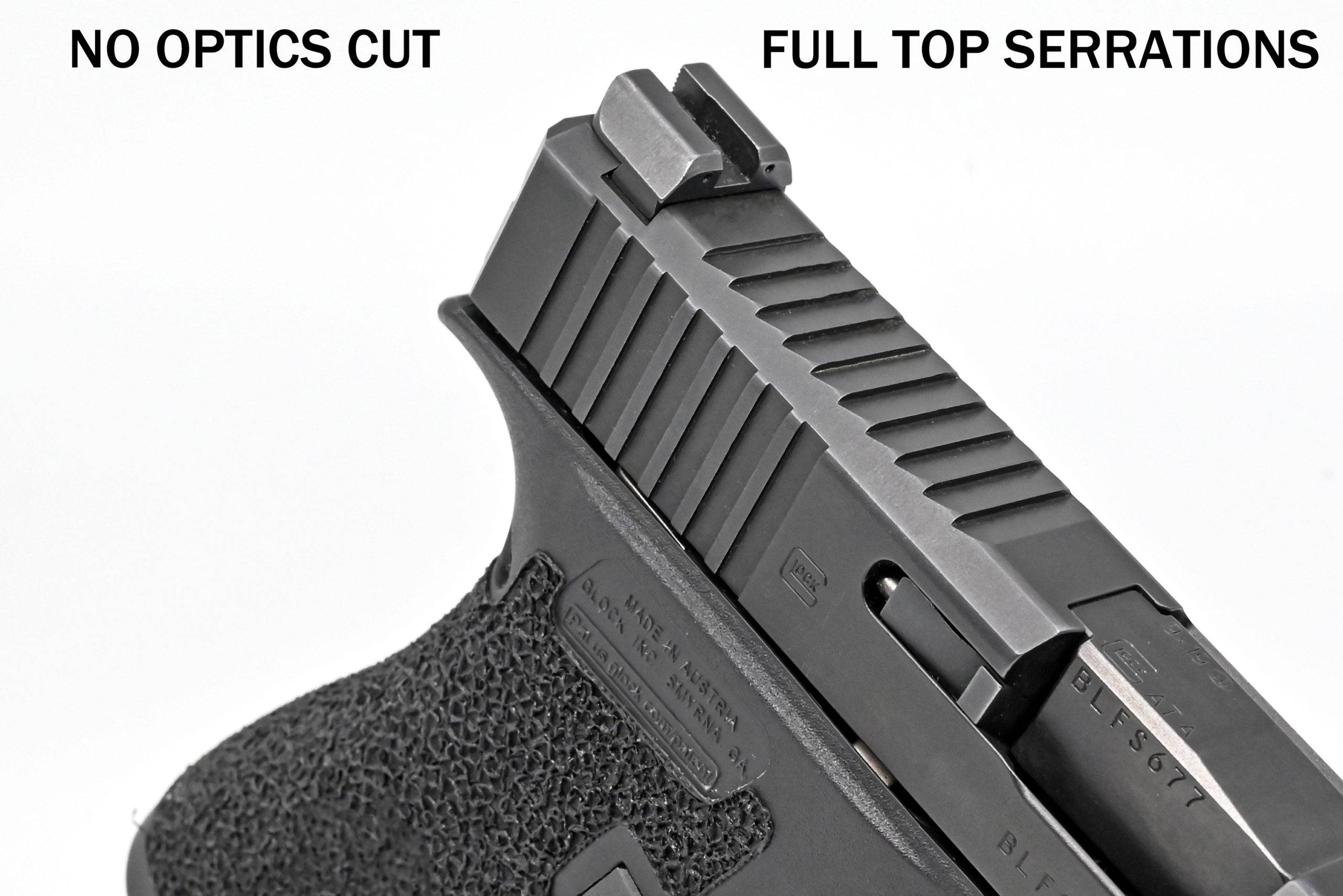 This package comes standard with our RDS / Optic cut to match the RDS / Optic of your choice. This package can be done with NO optic cut for the same price and you will receive straight top serrations across the entire top of the slide in place of the optic cut.